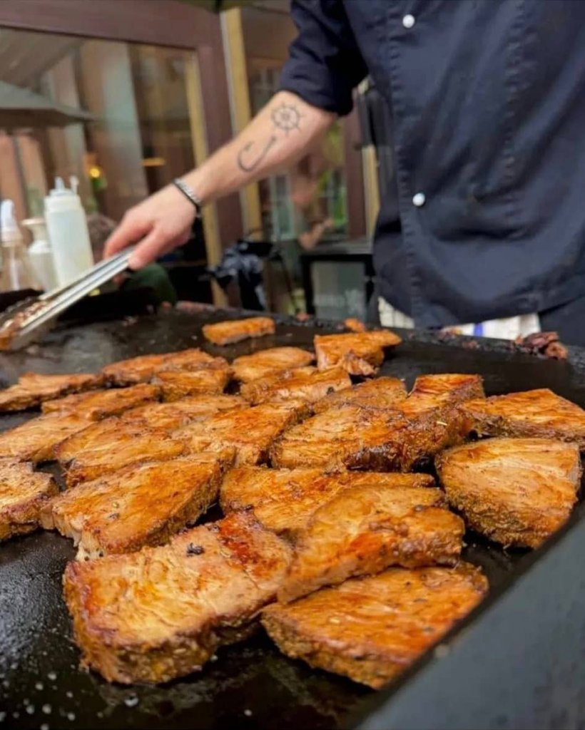 Grillad Choritzo med örtrostade morötter persiljestuvad potatis friterad lök